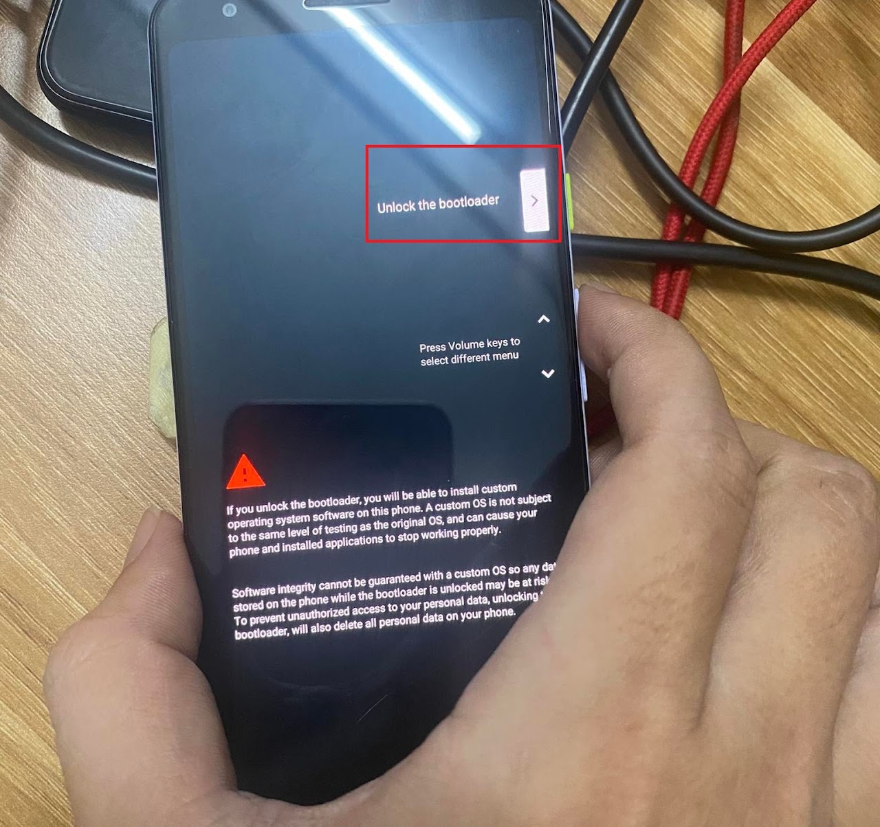 3. Trên điện thoại hiện như hình , bấm volume cộng để chọn dòng Unlockbootloader, sau đó bấm phím nguồn để tiến hành Unlock