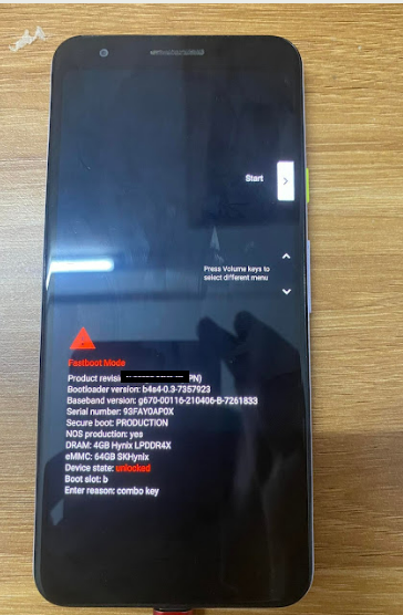 5. Tắt nguồn điện thoại -> giữ Nguồn + Voume trừ để đưa điện thoại vào chế độ fastboot (Như hình bên dưới)