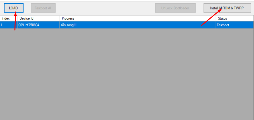 6. Bấm LOAD để hiển thị devices -> Bấm Install MiROM & TWRP để tiến hành cài , kiên nhẫn đợi phần mềm tự cài vào điện thoại